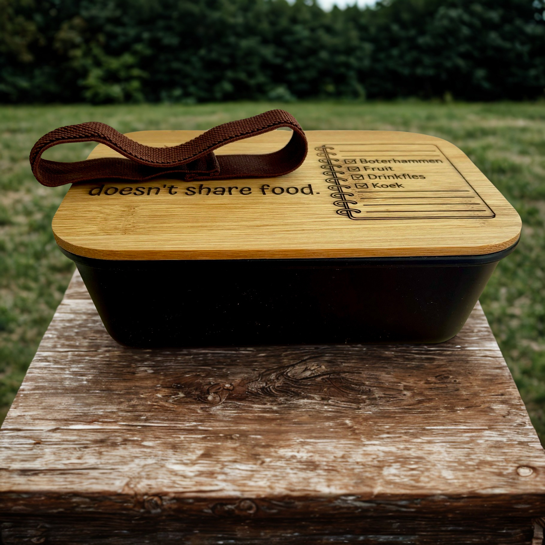 Gepersonaliseerde, duurzame brooddoos met bamboe deksel.
