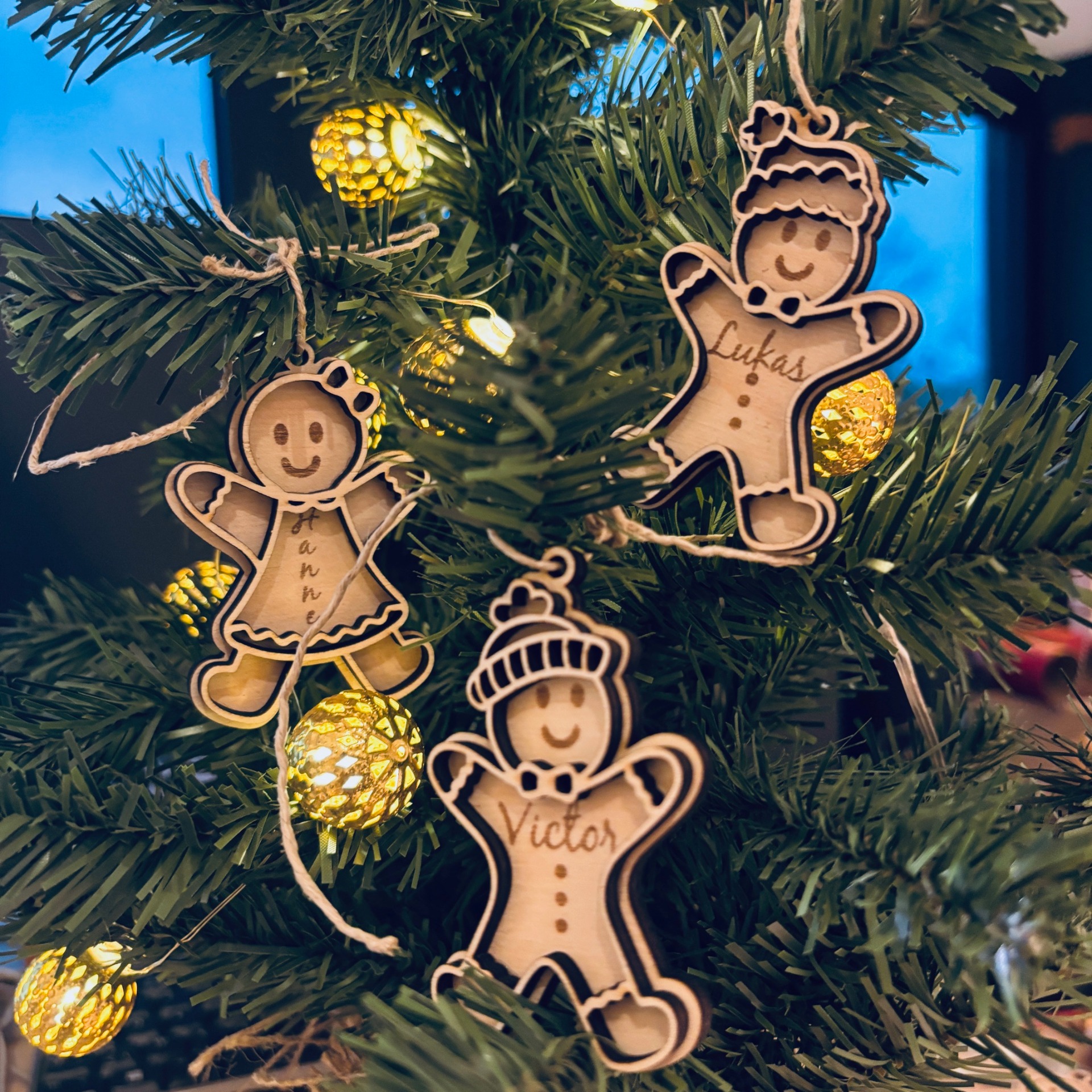 Breng extra warmte in je kerstboom met onze handgemaakte houten koekenmannetjes. Elk stuk wordt gepersonaliseerd met naam, zorgvuldig gelaserd in ons atelier en afgewerkt met oog voor detail.